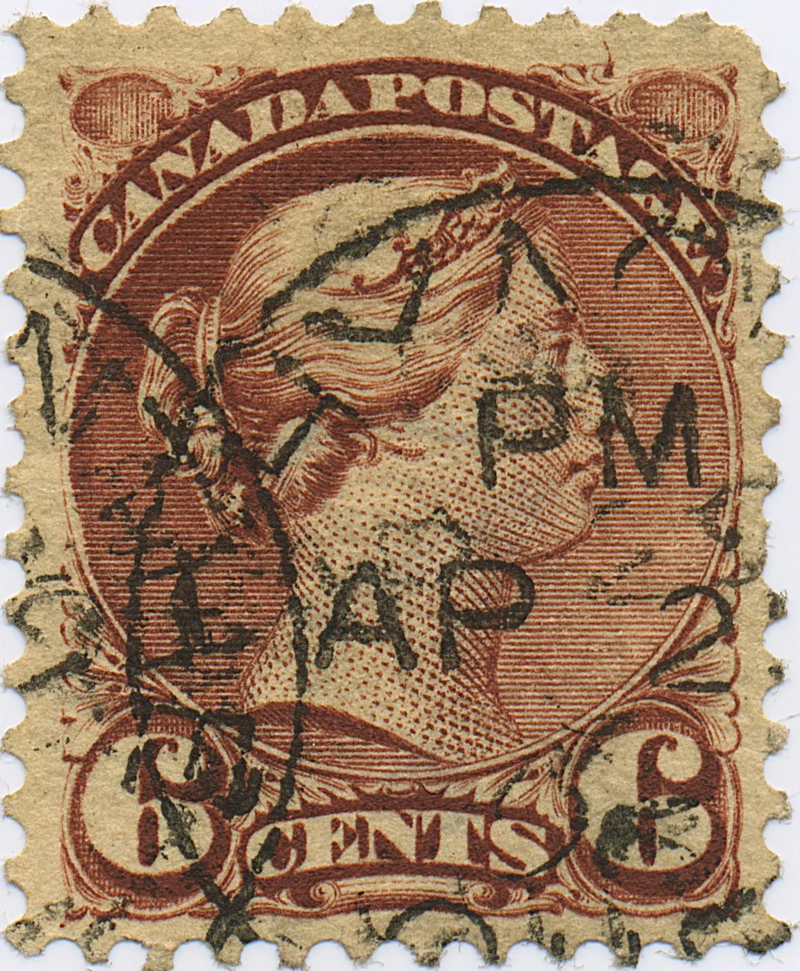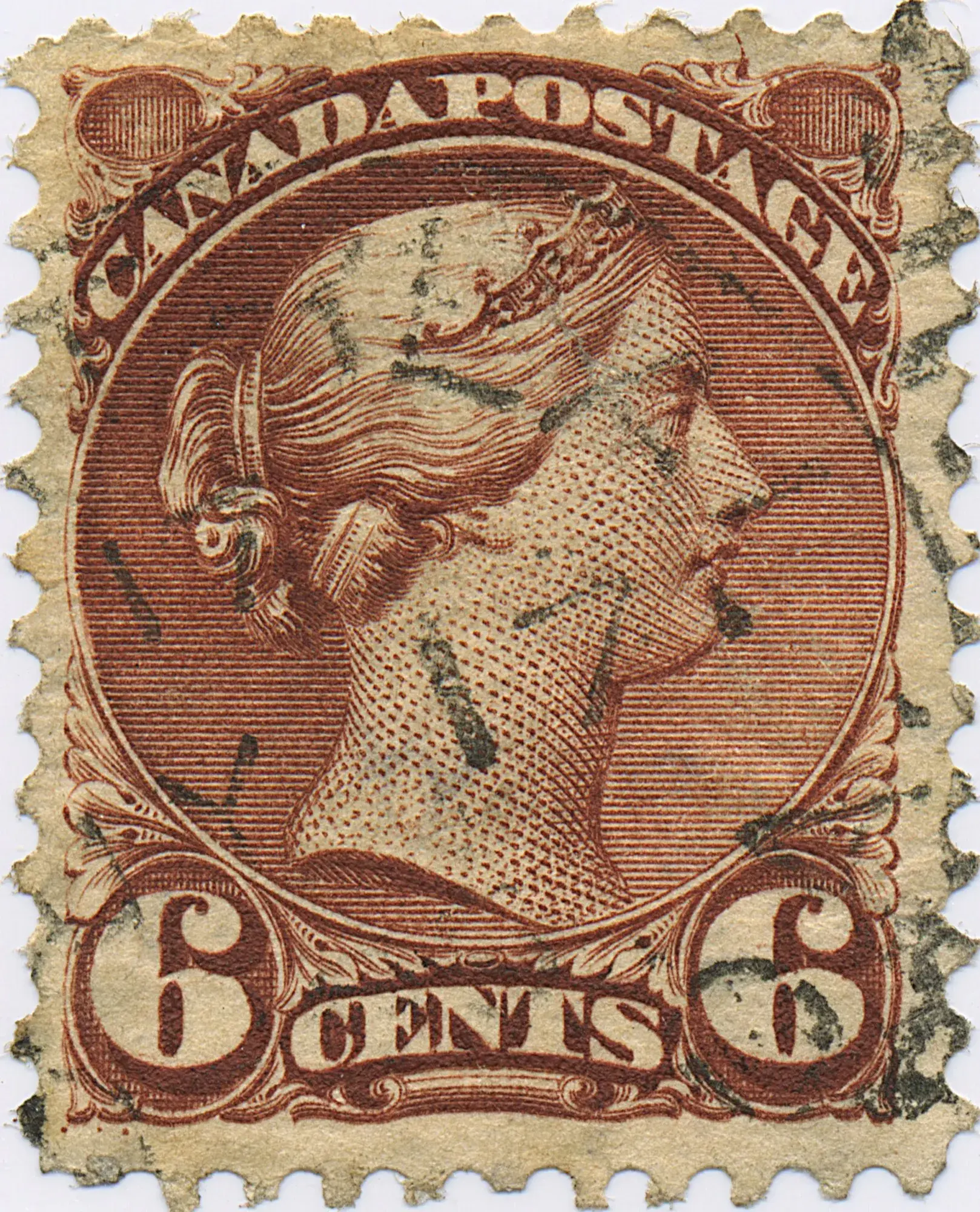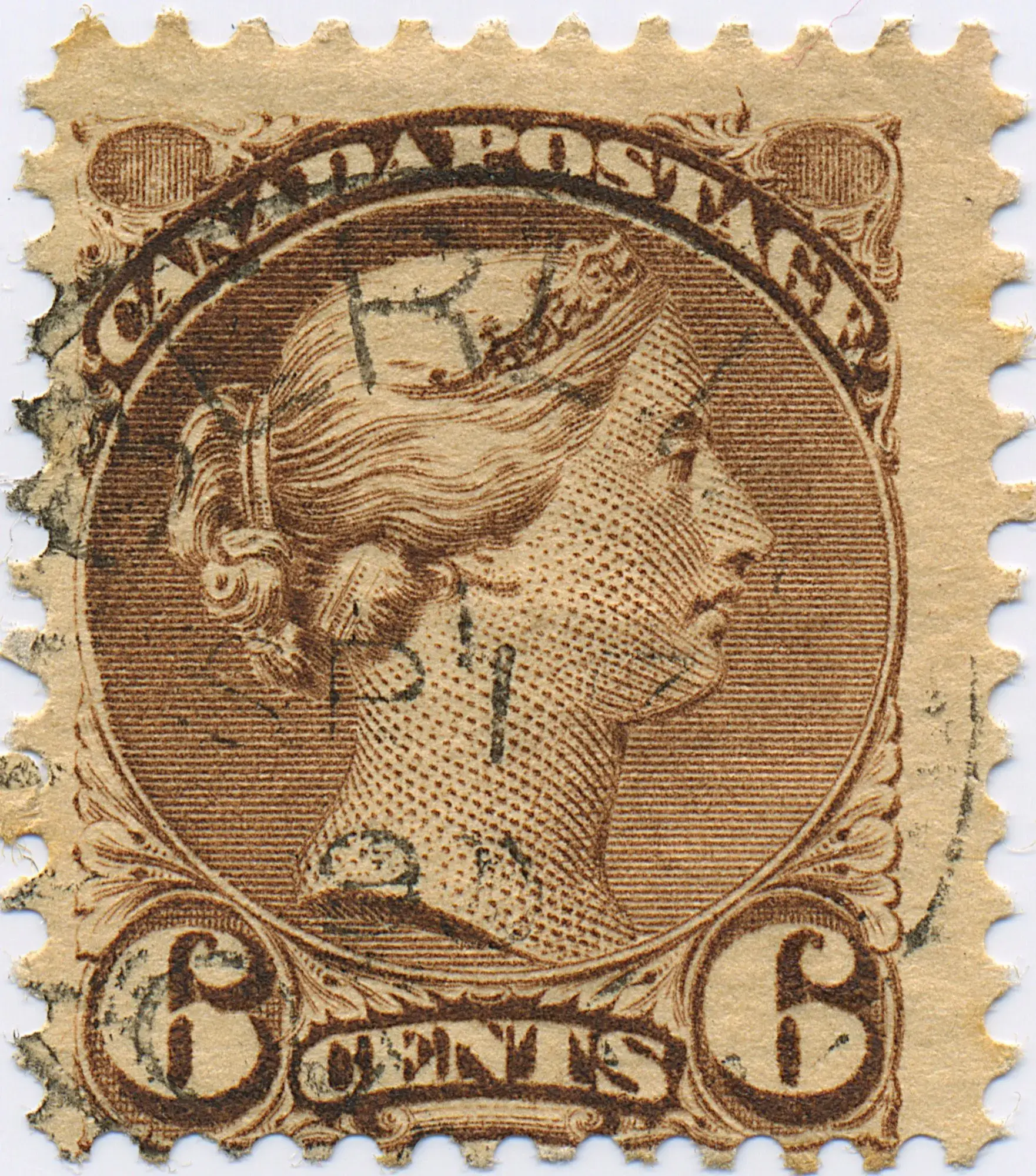 One of the few varieties which occurs in both major shades of the Six Cent Later in the life of the variety 6F4.1, a flaw in the C of Canada occured - 6F12.3.